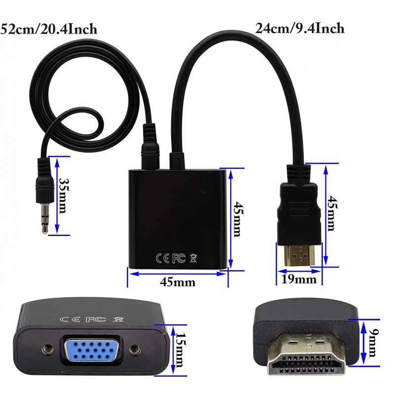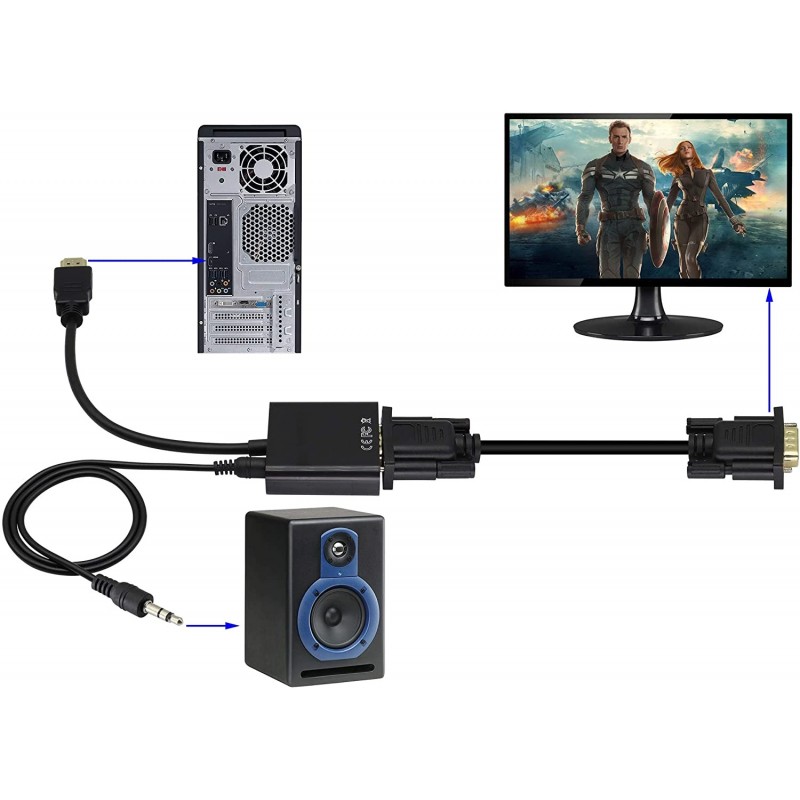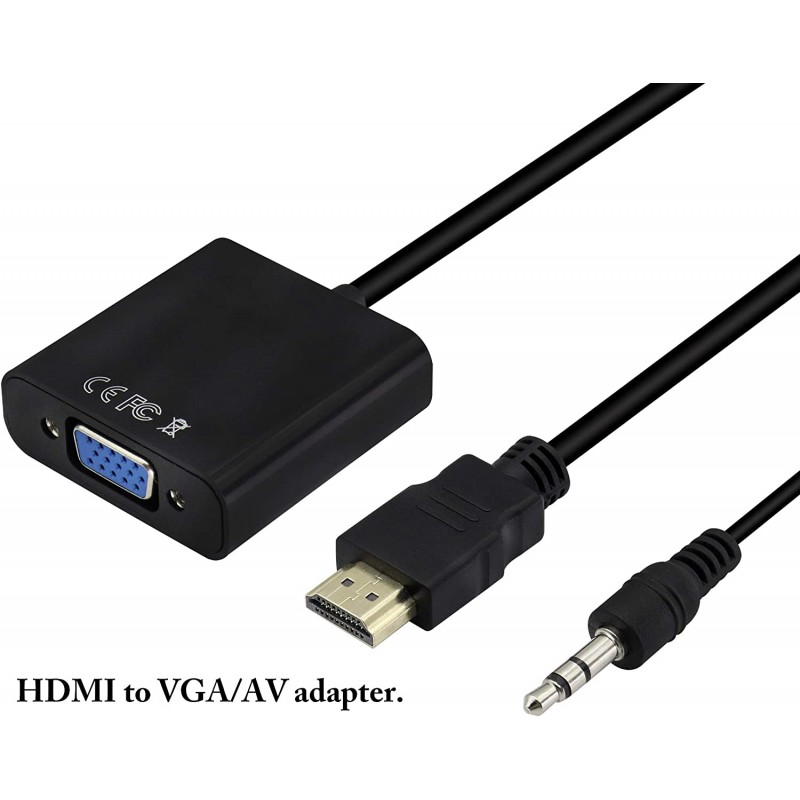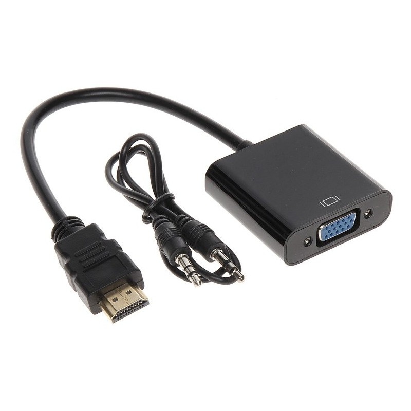 Adapter konwertuje cyfrowy sygnał HDMI do sygnału analogowego VGA plus dźwięk audio ( podawany przez kabel Jack )