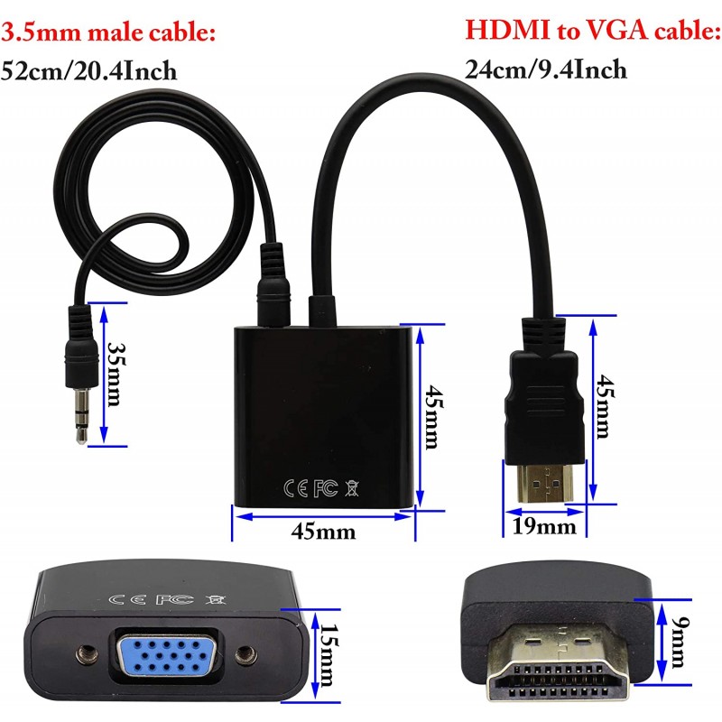 - Połączenie: 19 pinowy HDMI-A męski > 15 pinowy VGA żeński