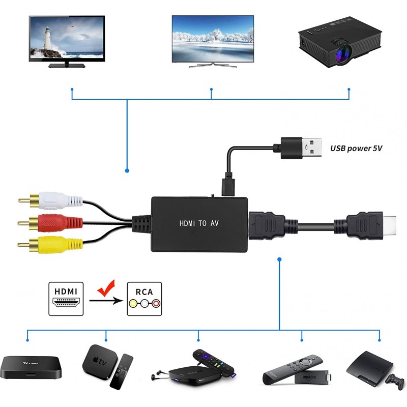 Umożliwia podłączenie nowoczesnych urządzeń z portem HDMI (nie posiadających gniazd RCA), takich jak odtwarzacze DVD/Blu-Ray i konsole do gier do telewizorów lub projektorów starszego typu nie wyposażonych w port HDMI.