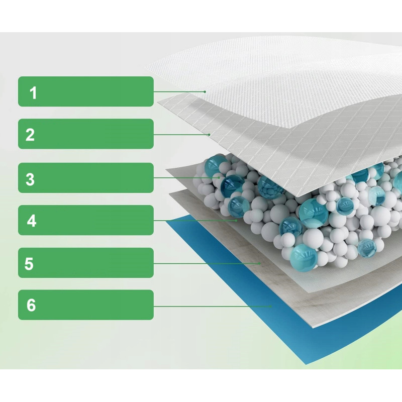 - Wysoka Chłonność: 6-warstwowa konstrukcja zapewnia maksymalną ochronę przed wilgocią. Każda warstwa została zaprojektowana tak, aby skutecznie wchłaniać płyny i zapobiegać wyciekaniu.