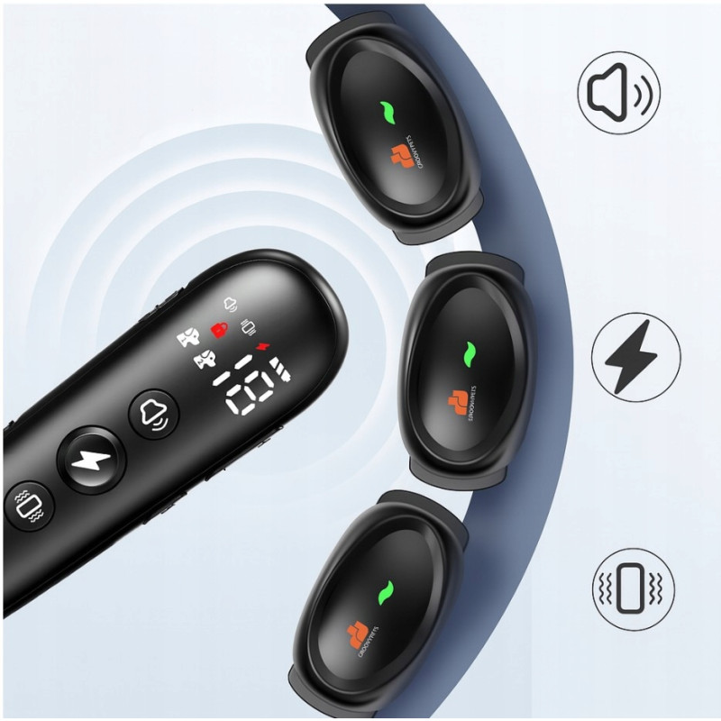 - 3 tryby działania: sygnał dźwiękowy (1–8 poziomów), wibracje (1–16 poziomów), impuls elektrostatyczny (1–18 poziomów)