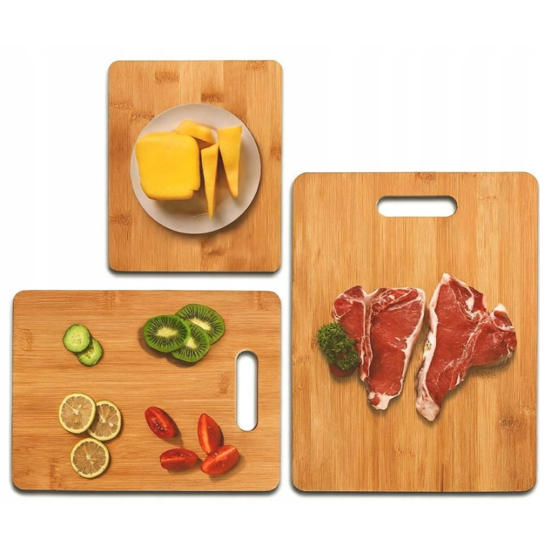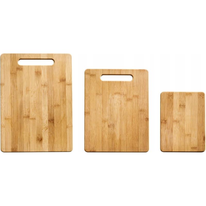 Zestaw trzech desek bambusowych to komplet, który usprawni przygotowywanie posiłków i pomoże dbać o higienę w kuchni (łatwo rozdzielisz mięso, warzywa i pieczywo). Gładka, dwustronna powierzchnia jest przyjazna dla ostrzy, a zintegrowane otwory-uchwyty w większych deskach ułatwiają przenoszenie i wieszanie. Bambus jest lżejszy i twardszy niż wiele gatunków drewna, a przy tym odnawialny i bezpieczny dla żywności.