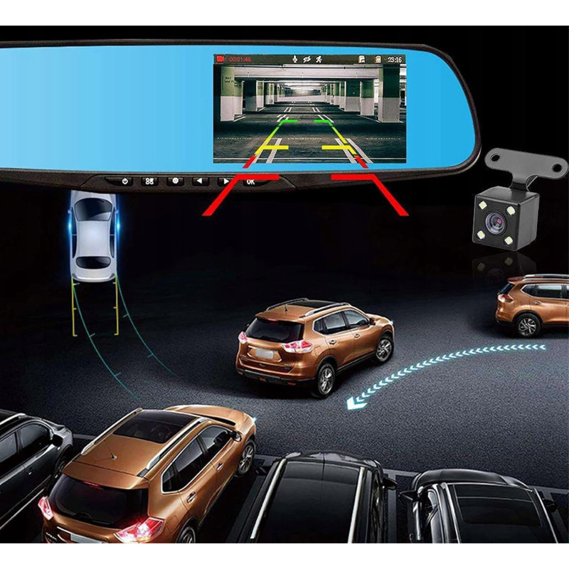 - Ekran 4,3” TFT LCD – zintegrowany z lusterkiem, dyskretny i wygodny w obsłudze.