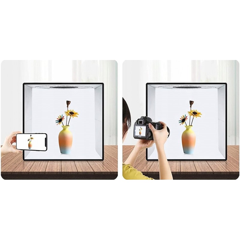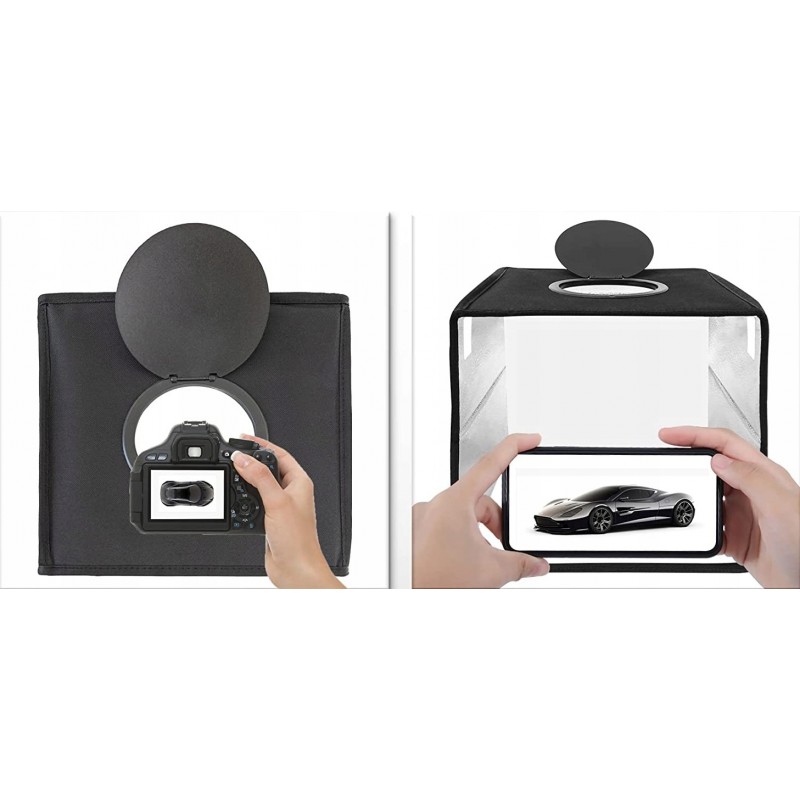 Szeroki front pozwala na fotografowanie większych obiektów, brak przedniej ściany pozwala uniknąć niechcianych refleksów na powierzchni a otwór z góry namiotu daje możliwość fotografowania nawet gładkich, lustrzanych powierzchni.