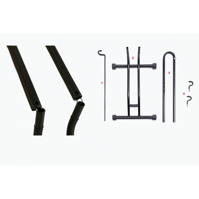 Połóż element 2 (podstawa z dwoma rurami pionowymi) na płaskiej powierzchni. Następnie włóż element 1 (długi pionowy pręt z haczykiem) w gniazdo znajdujące się na szczycie elementu 3, tak aby wszedł pewnie i stabilnie, do stabilizacji użyj dedykowanej śruby motylkowej.