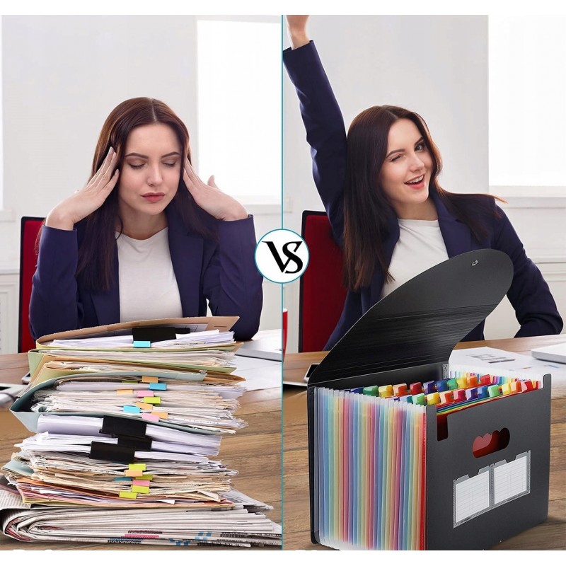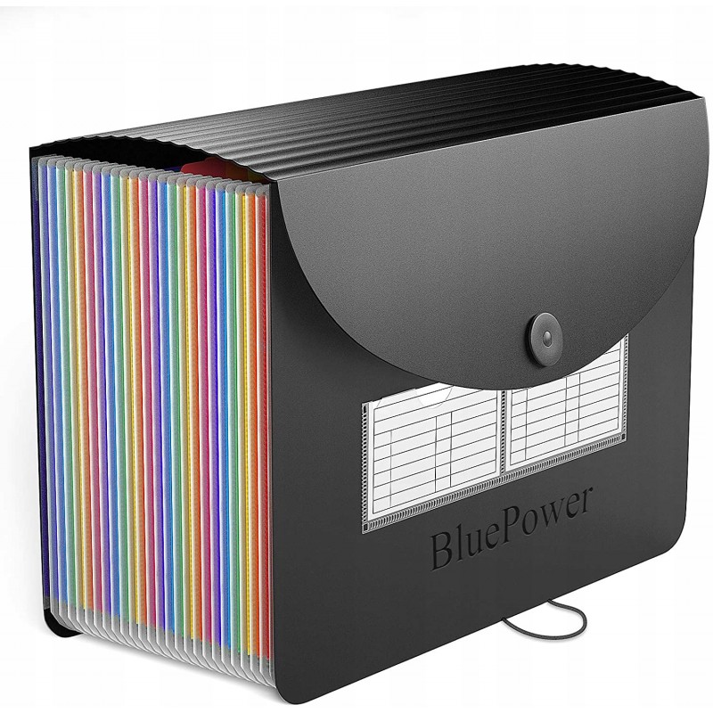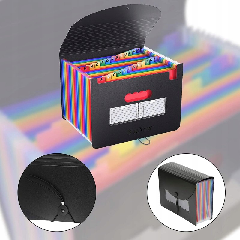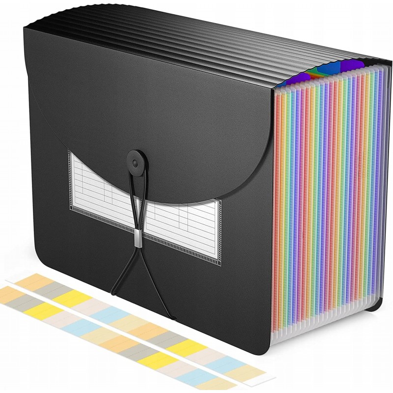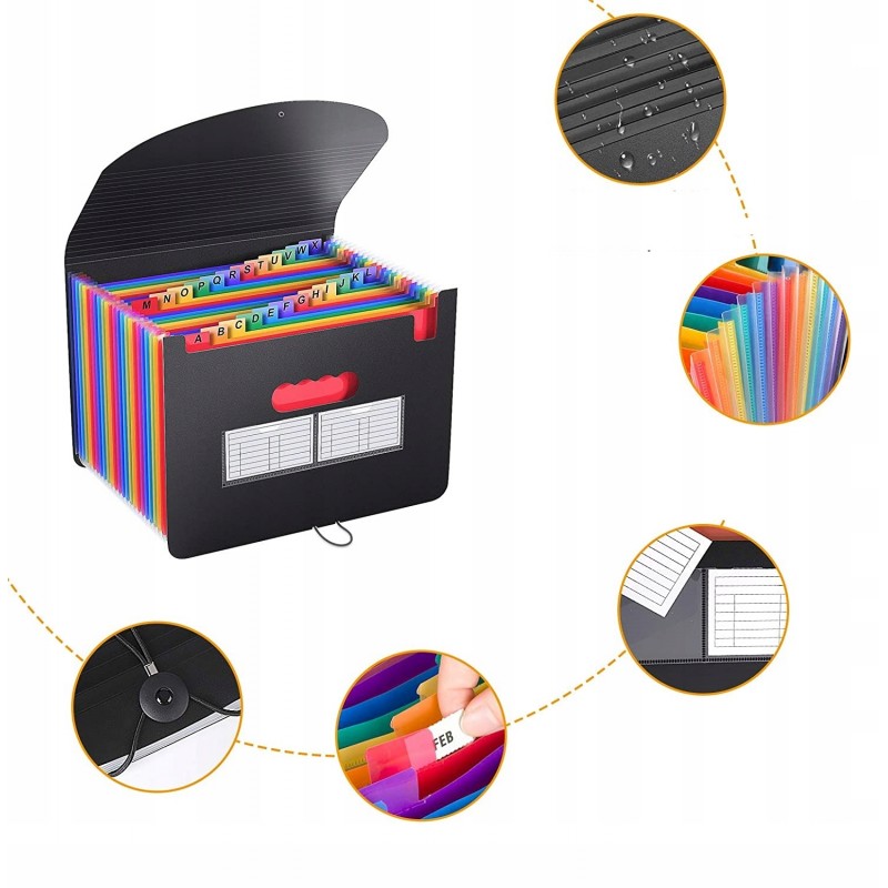 Oszczędza czas - 24 kolorowe kieszenie z górnymi zakładkami tworzą niezależne miejsca na dokumenty. Można użyć dostarczonych kolorowych etykiet do sortowania dokumentów według kategorii, co skraca czas wyszukiwania dokumentów.