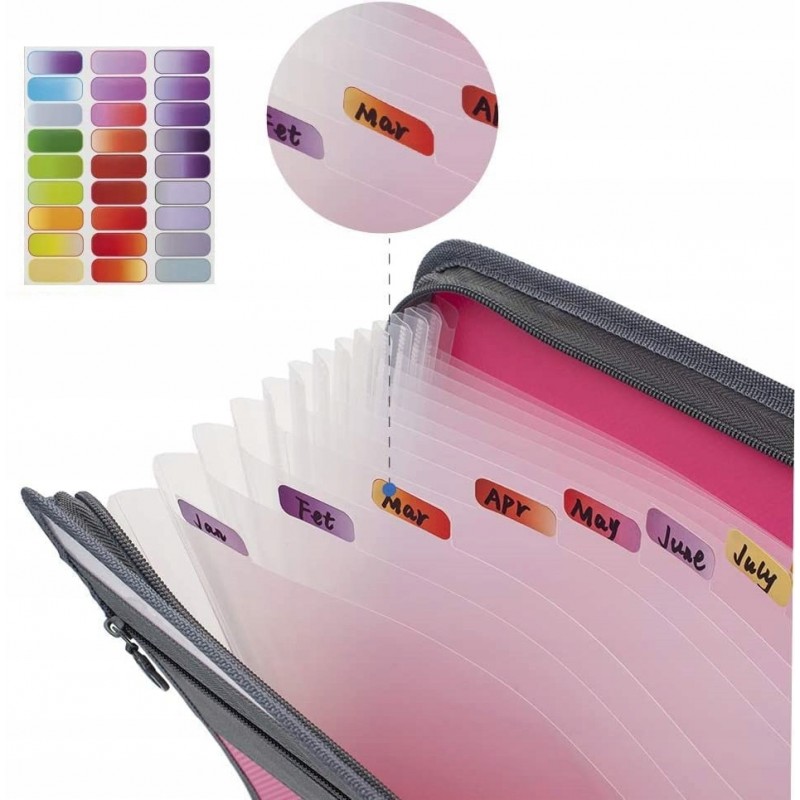 Oszczędza czas - 13 kolorowych kieszenie z górnymi zakładkami tworzą niezależne miejsca na dokumenty. Można użyć dostarczonych kolorowych etykiet do sortowania dokumentów według kategorii, co skraca czas wyszukiwania dokumentów.