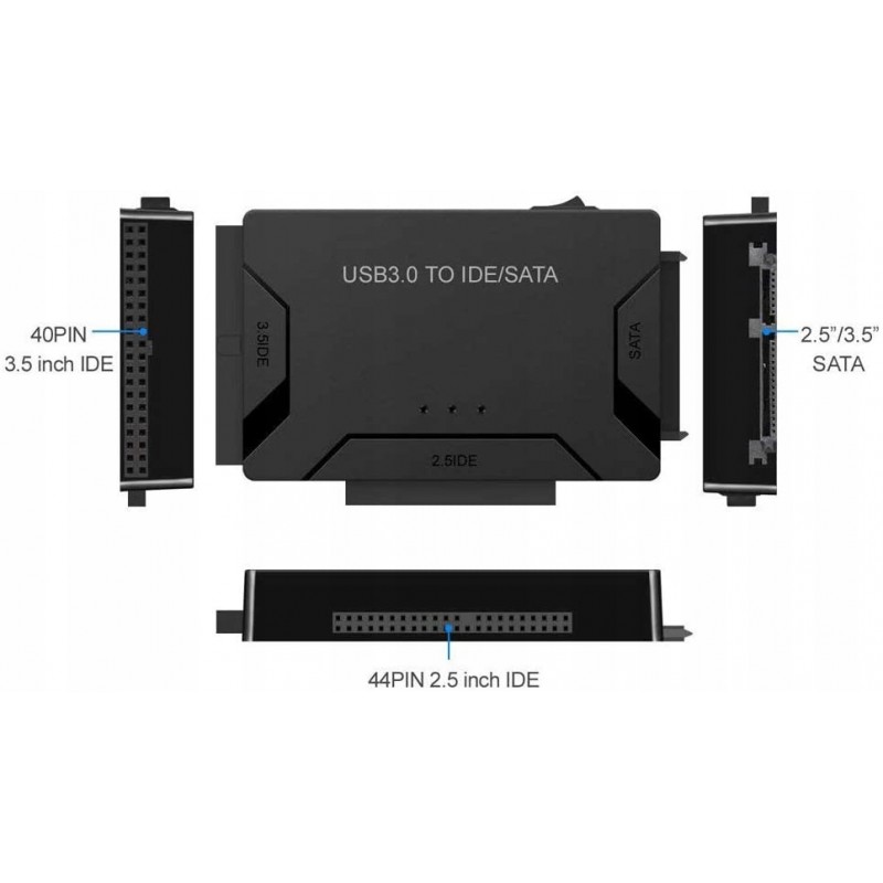 Konwerter (mostek) USB 3.0 na SATA/ IDE łączy dyski twarde IDE / SATA 2,5 "/ 3,5" z komputerem przez port USB. Pozwala szybko przesyłać duże ilości danych z jednego dysku na drugi. Posiada złącze SATA II i dwa złącza IDE (40-pinowe i 44-pinowe), wszystkie trzy dyski twarde mogą działać jednocześnie. Jest to idealny sposób zwiększenie pojemności w notebooku lub komputerze stacjonarnym.