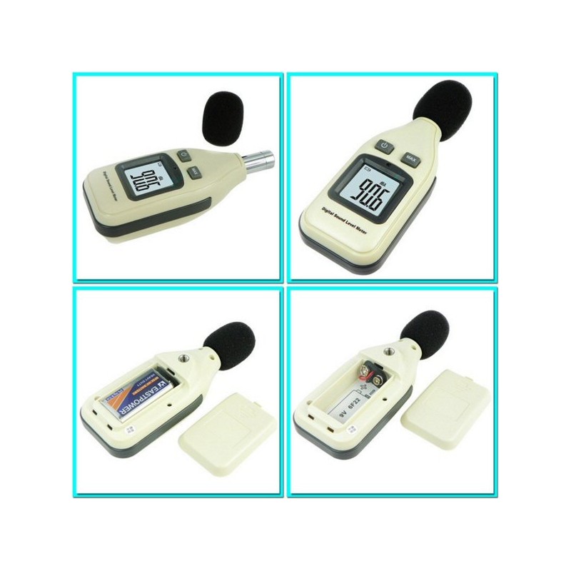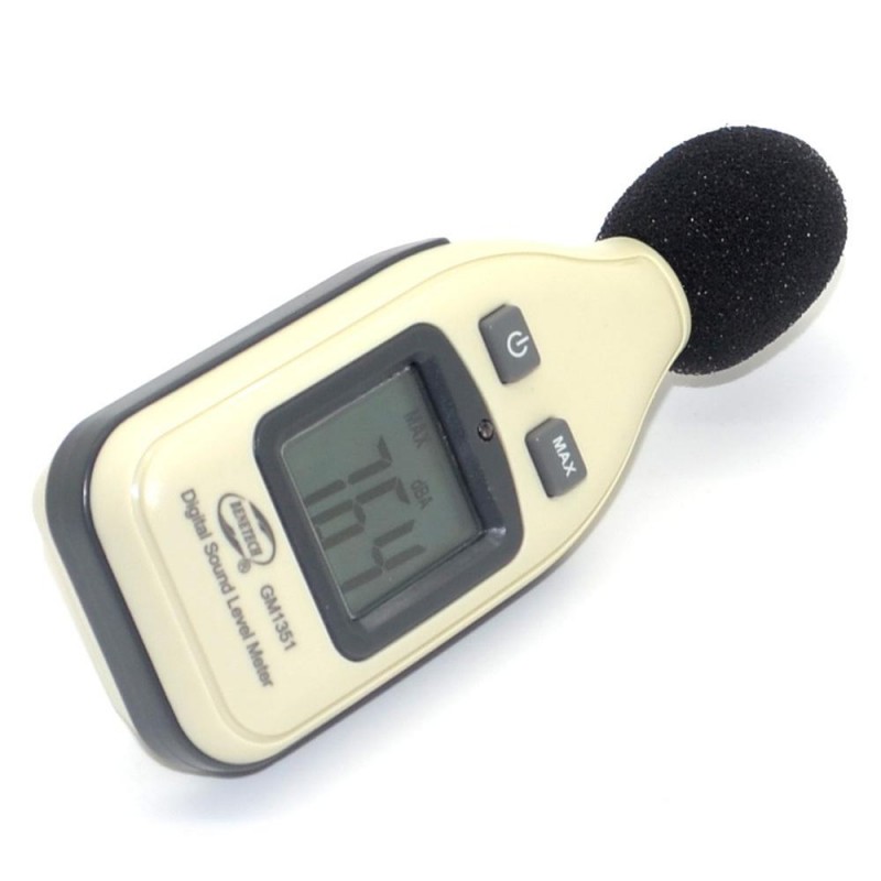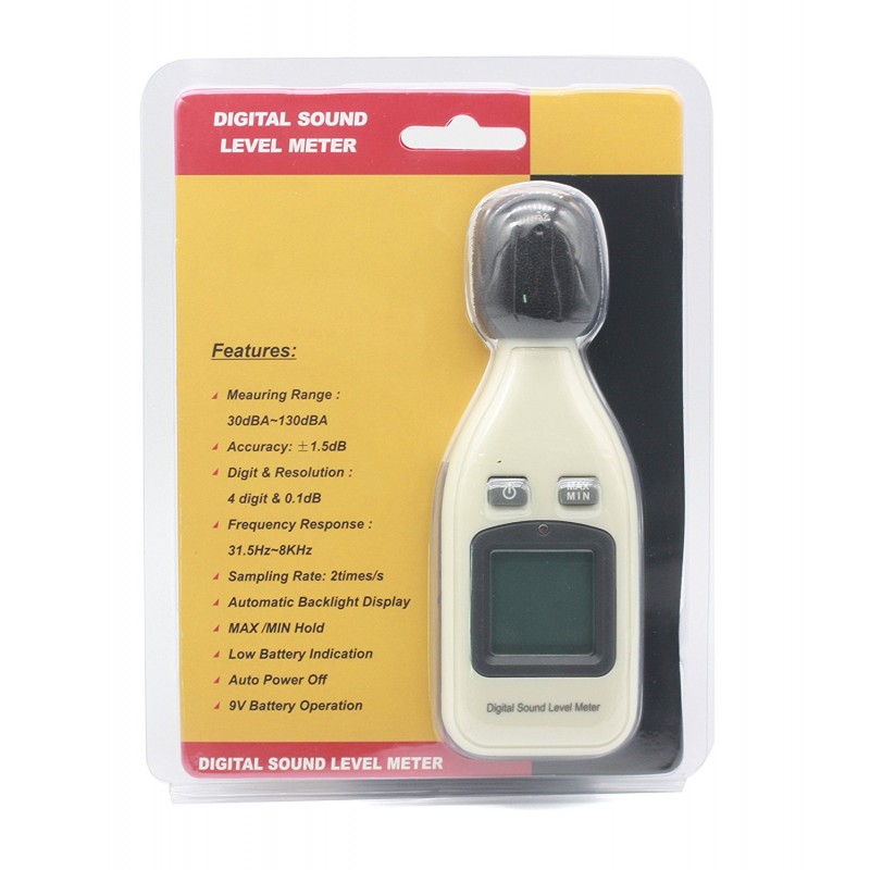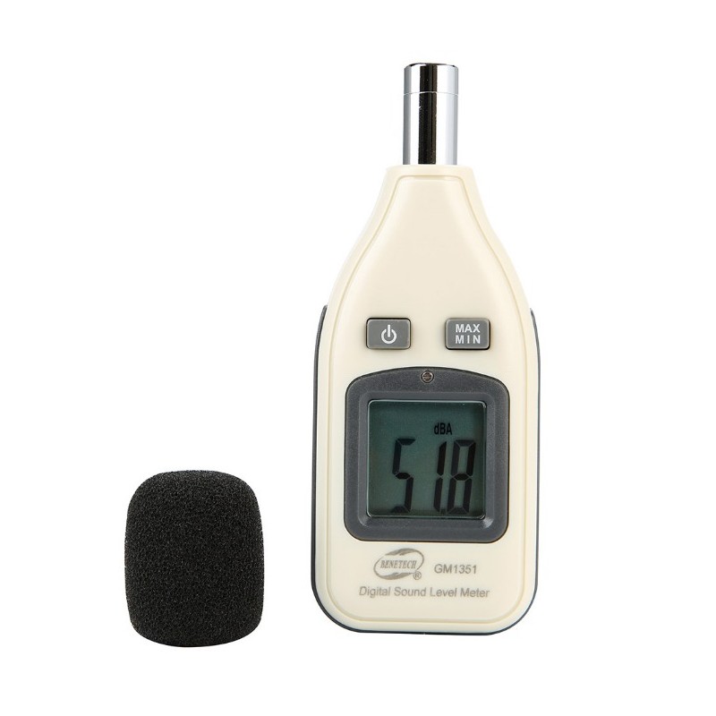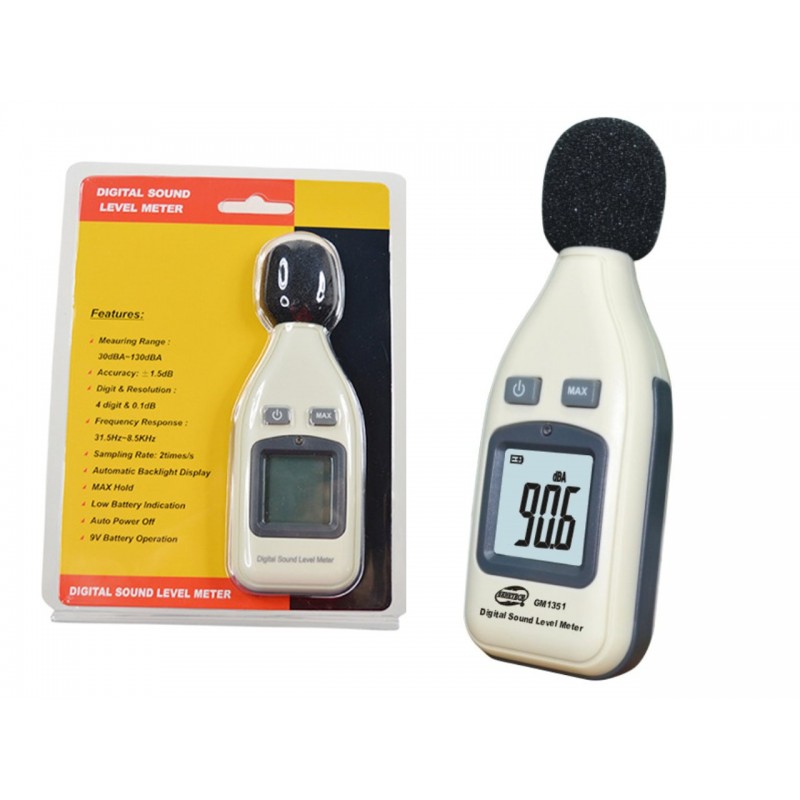 Miernik, decybelomierz, sonometr może mierzyć poziom hałasu pomiędzy 30dBA ~ 130dBa, redukując jednocześnie skutki szumu wiatru, aby uzyskać dokładniejsze odczyty.