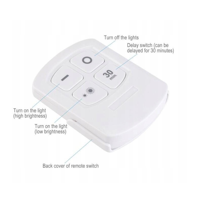 Bezprzewodowe lampki LED to uniwersalny produkt, który znajdzie zastosowanie w praktycznie każdym pomieszczeniu. Strumień światła jest mocny, o dużym zasięgu, lecz można zredukować jego jasność za pomocą pilota dołączonego do zestawu. Dzięki niemu możemy kontrolować lampki na odległość. Można je włączyć również poprzez naciśnięcie środka lampki.