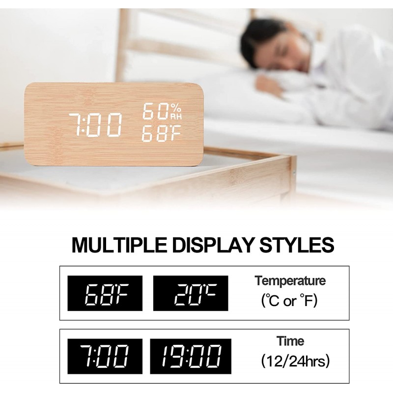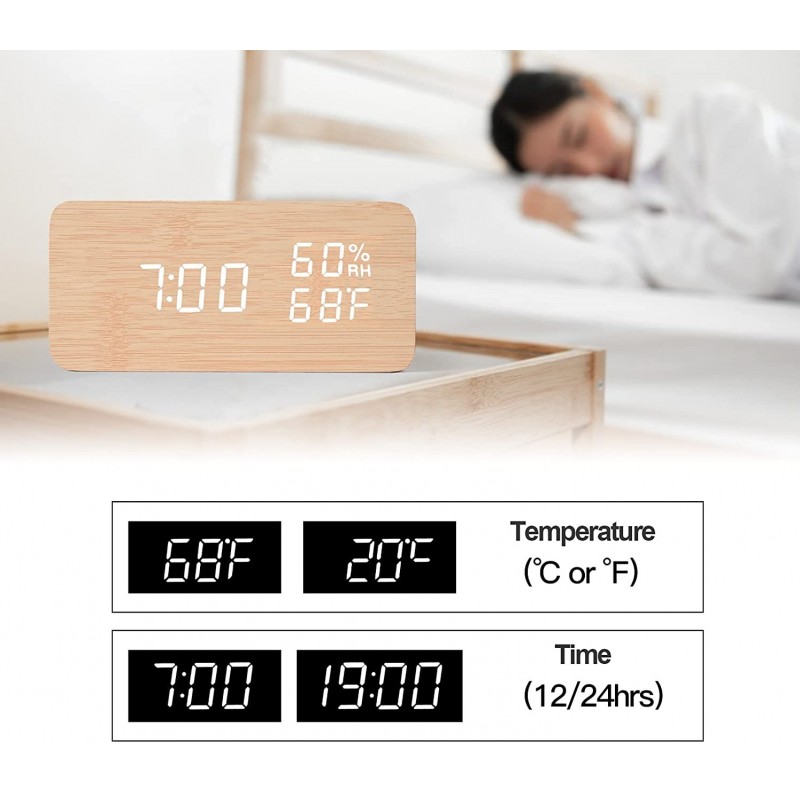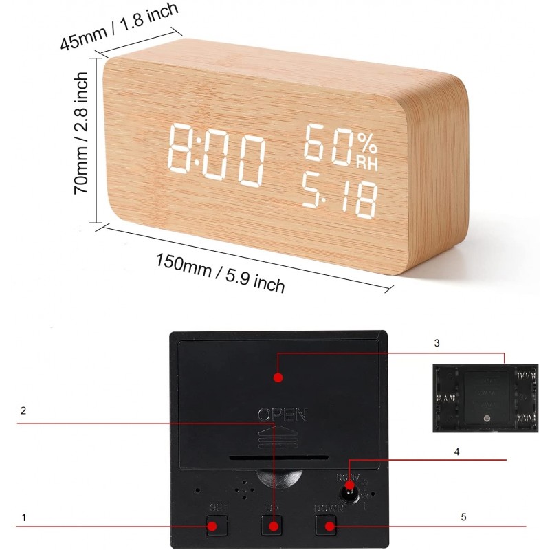 Nowoczesny i estetyczny zegarek cyfrowy z imitacją drewnianego wykończenia to doskonały dodatek do sypialni, biura czy salonu. Jego podświetlane cyfry są doskonale widoczne w dzień i w nocy, funkcja alarmu sprawdza się na co dzień a elegancki wyświetlacz wspaniale prezentuje się w każdym wnętrzu. Urządzenie posiada również funkcję kalendarza oraz mierzy temperaturę oraz wilgotność powietrza.
