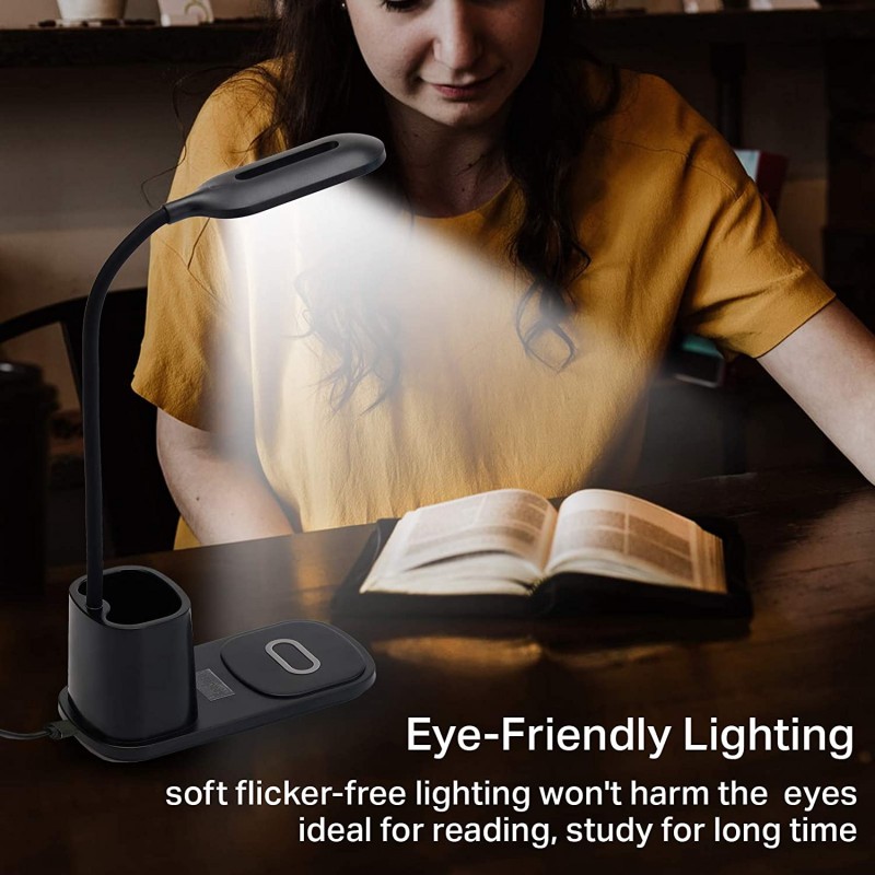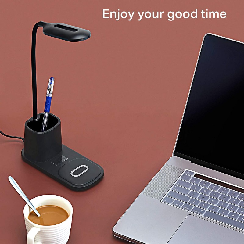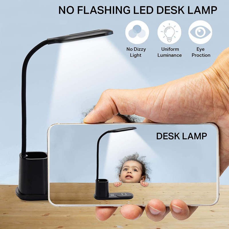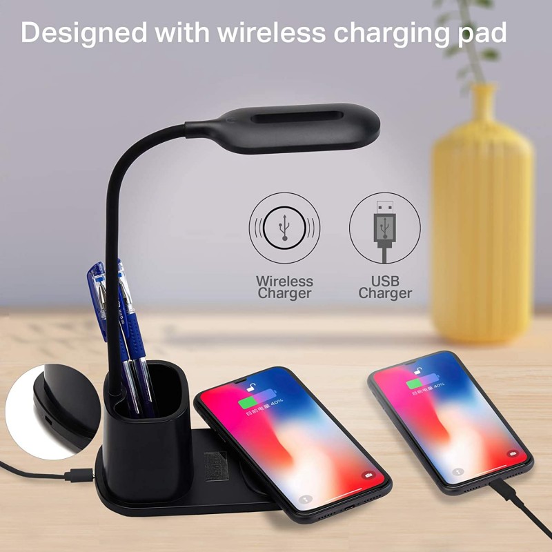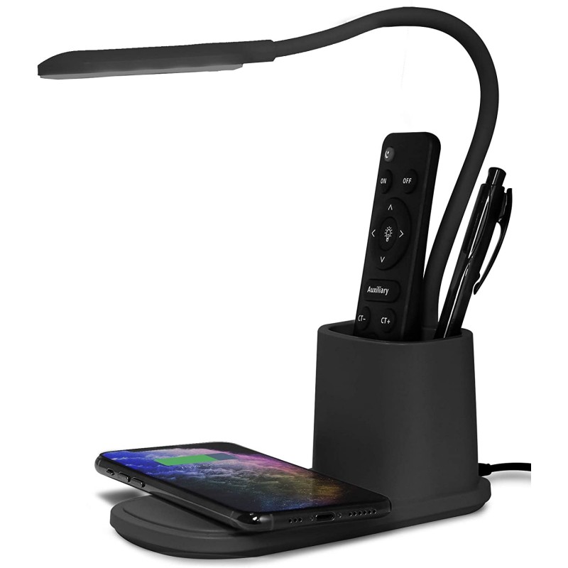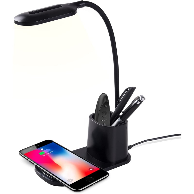 Nowoczesna lampa LED z ładowarką QI, regulacją barwy światła i pojemnikiem na długopisy.
