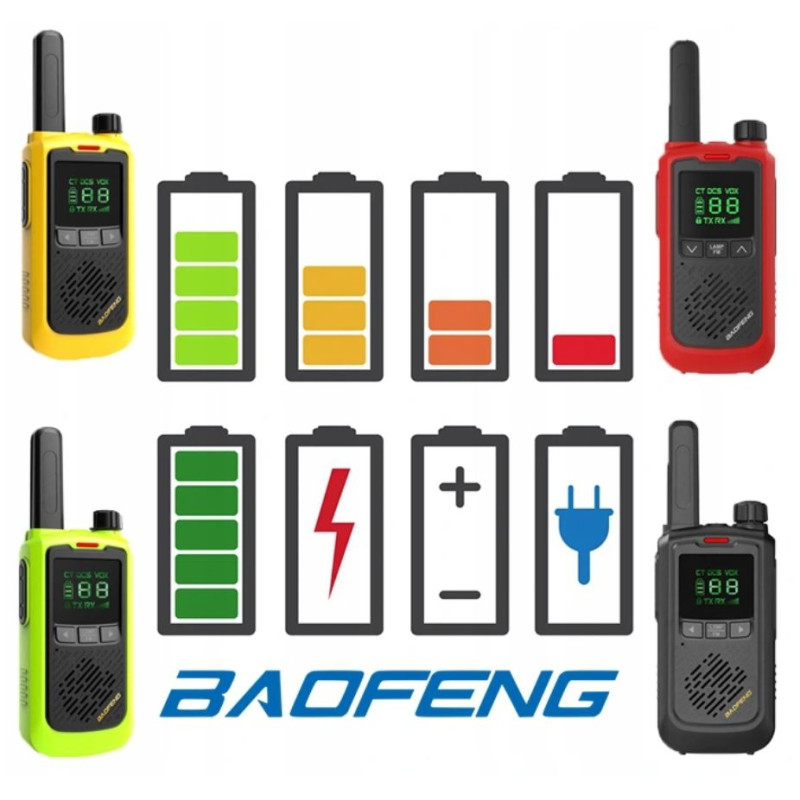 Krótkofalówki są zasilane akumulatorami o pojemności 1500 mAh, co pozwala na bardzo długi czas pracy.