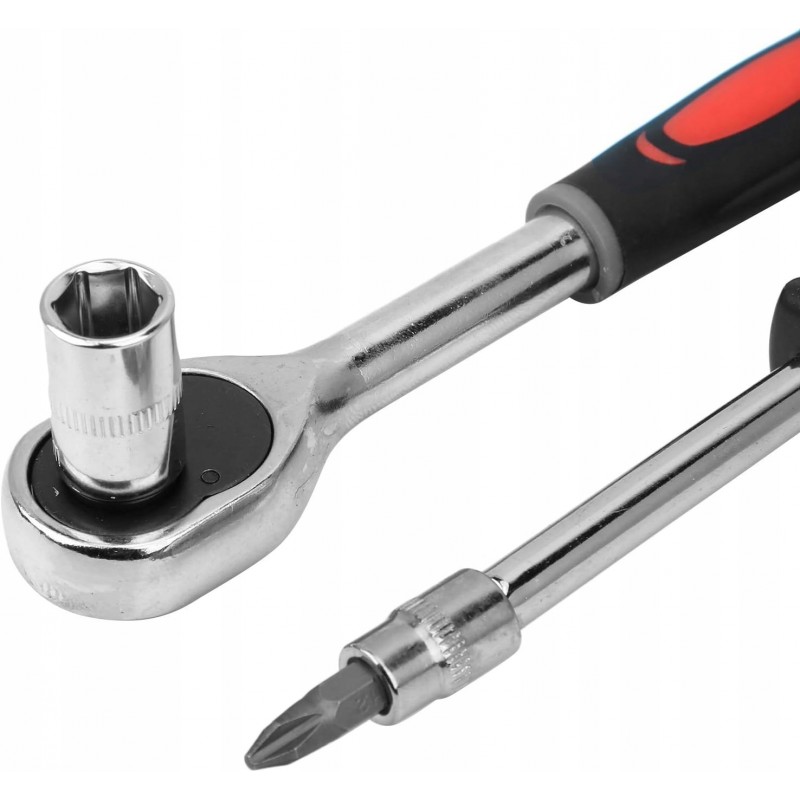 Zestaw Kluczy Nasadowych - 46 Elementów zasługuje na szczególne uznanie za swoją prostotę w obsłudze. Mechanizm zwalniający grzechotki pozwala na szybką i łatwą wymianę nasadek, podczas gdy różne rozmiary nasadek umożliwiają pracę z szeroką gamą śrub i nakrętek.