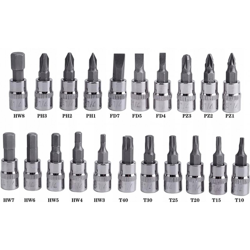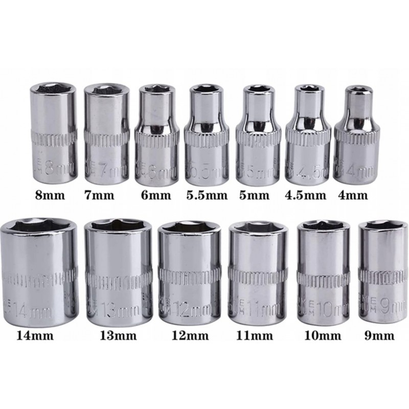 - 13 szt. Nasadki 1/4'': 4; 4.5; 5; 5.5; 6; 7; 8; 9; 10; 11; 12; 13; 14 mm