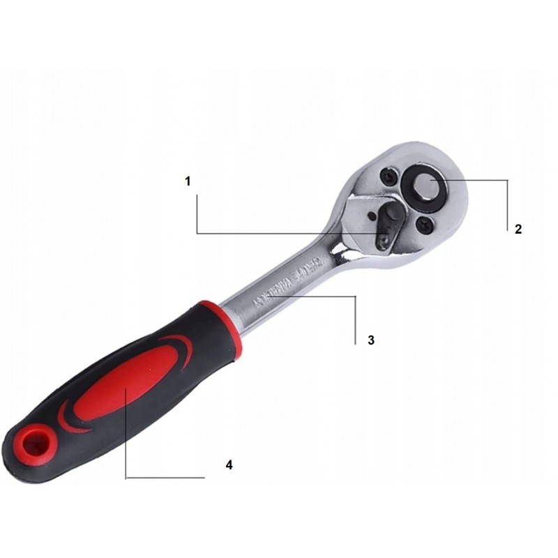 Grzechotka idealnie dopasowana do kluczy nasadowych i narzędzi. Posiada zatrzask kulowy, który pełni ważną funkcję bezpieczeństwa podczas prac montażowych, ponieważ zapewnia pewne osadzenie kluczy nasadowych oraz osprzętu