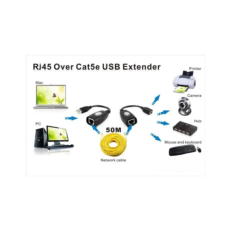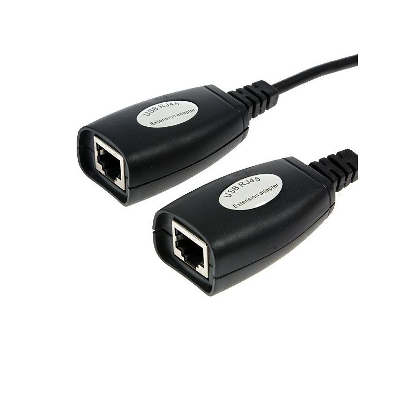 Przedłużacz USB umożliwia podłączanie urządzeń USB odległych nawet o 50 metrów za pośrednictwem kabla sieciowego typu skrętka (patch Cat5/5e/6), zakończonego standardowymi złączami RJ45.