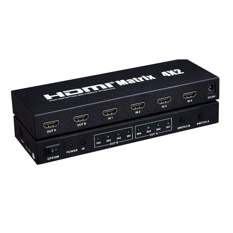 MATRIX ( Switch / Splitter ) HDMI 4 x 2 to urządzenie pozwalające na rozprowadzenie sygnału z 4 urządzeń źródłowych wyposażonych w standard HDMI na 2 urządzenia końcowe HDMI ( np. Projektor i TV ) jednocześnie i niezależnie.