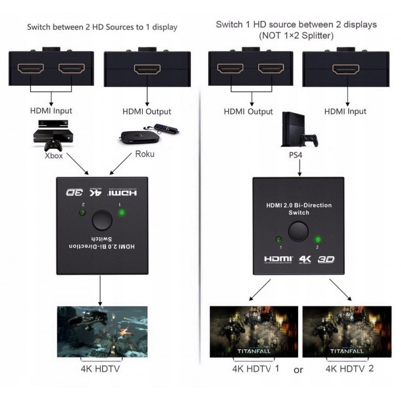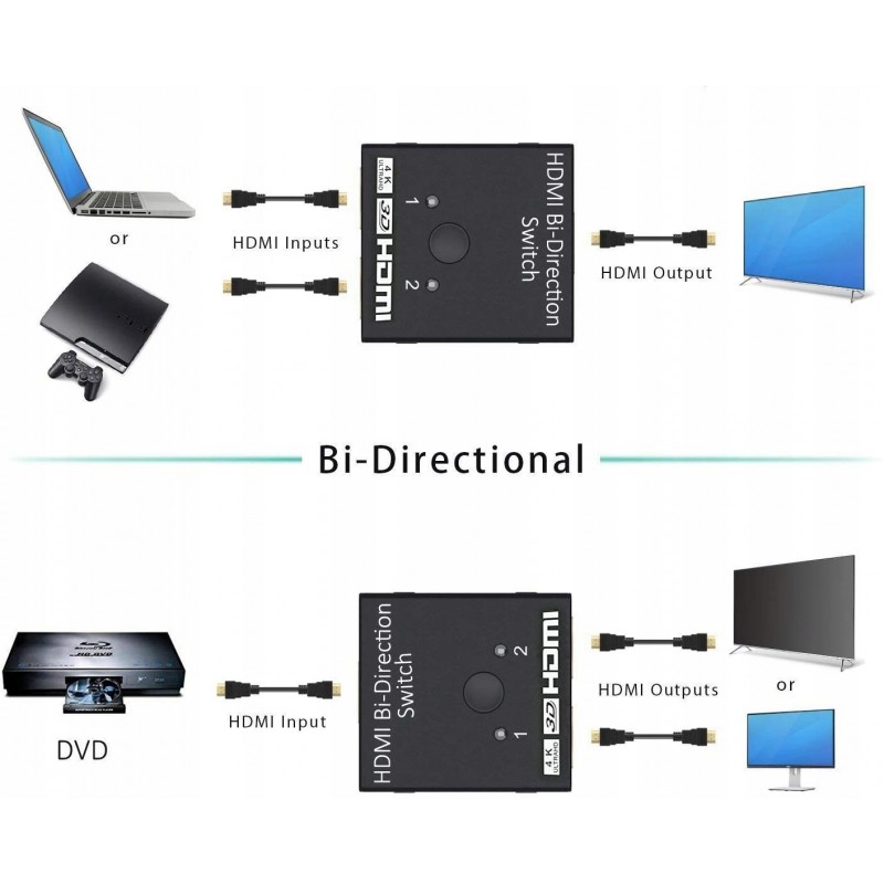 - DWUKIERUNKOWY PRZEŁĄCZNIK HDMI - Rozdzielacz HDMI 1 wejście 2 wyjścia / 2 wejścia 1 wyjście może podłączyć dwa źródła HDMI do jednego wyświetlacza HDMI lub podłączyć jedno źródło HDMI, aby przełączać między dwoma wyświetlaczami (wyświetla się tylko jeden monitor).
