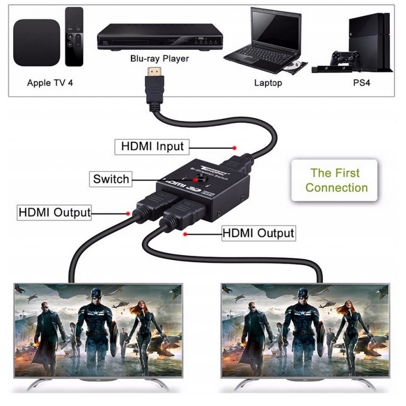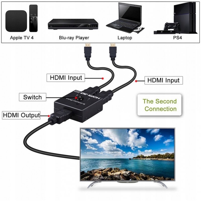 - SZEROKA KOMPATYBILNOŚĆ - HDMI Switcher działa z większością urządzeń wyposażonych w standardowy port HDMI. Kompatybilny z komputerem, notebookiem, XBox 360, XBox One, PS3, PS4, Apple TV, ROKU, Blu-Ray DVD, HD-Ready lub HDTV, odbiornikami DVB, monitorami, projektorami itp.