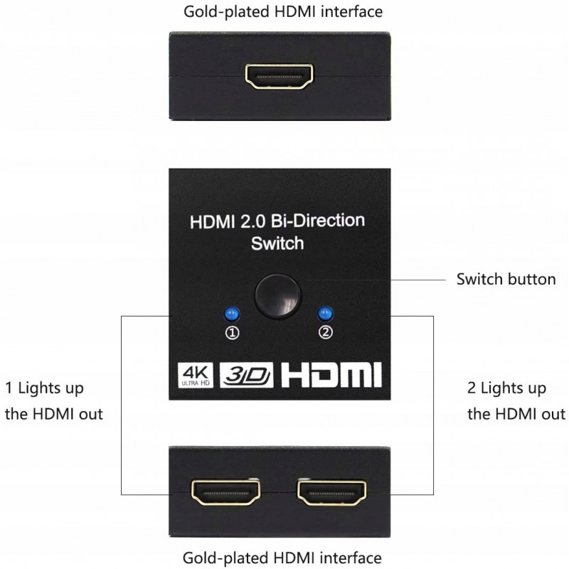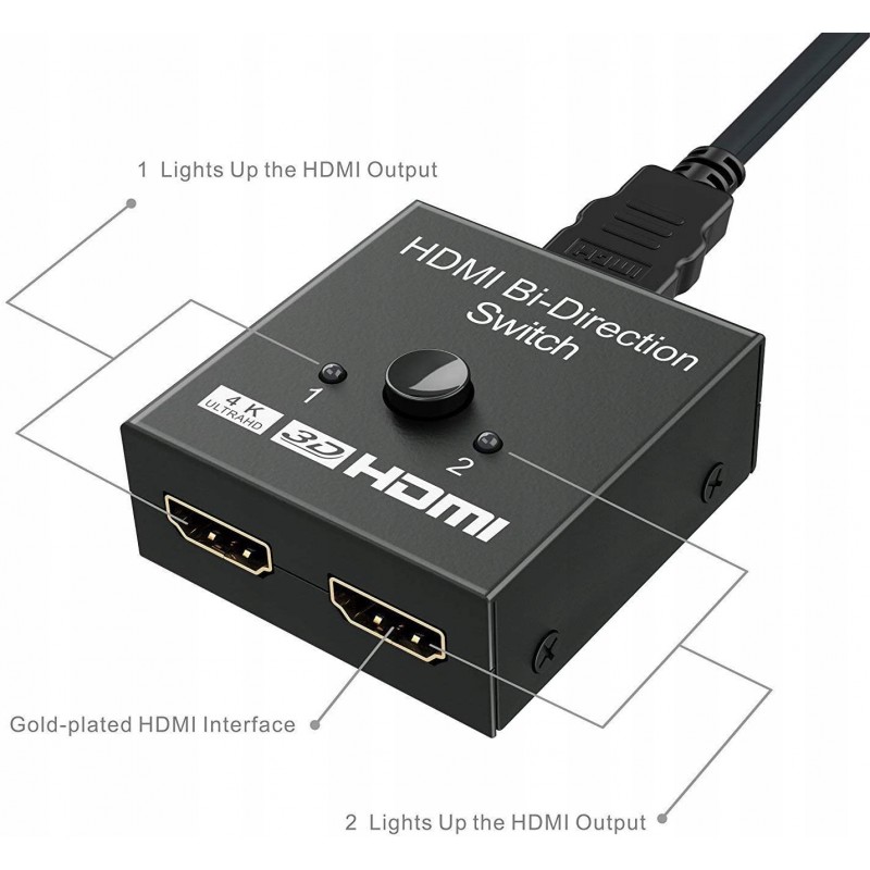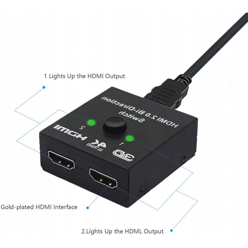 - PLUG AND PLAY - Nie wymaga zewnętrznego sterownika i zasilania, przełącznik HDMI będzie działał po podłączeniu. Wystarczy nacisnąć przycisk, aby zmienić źródło wejściowe lub wyjściowe, a wskaźnik LED informuje, który port jest aktywny.