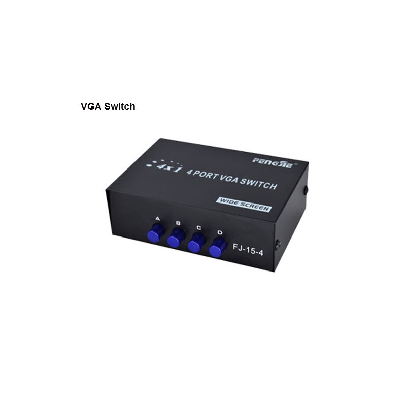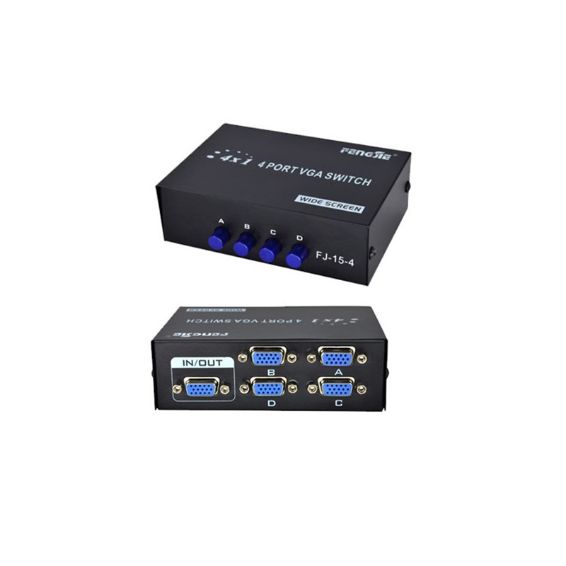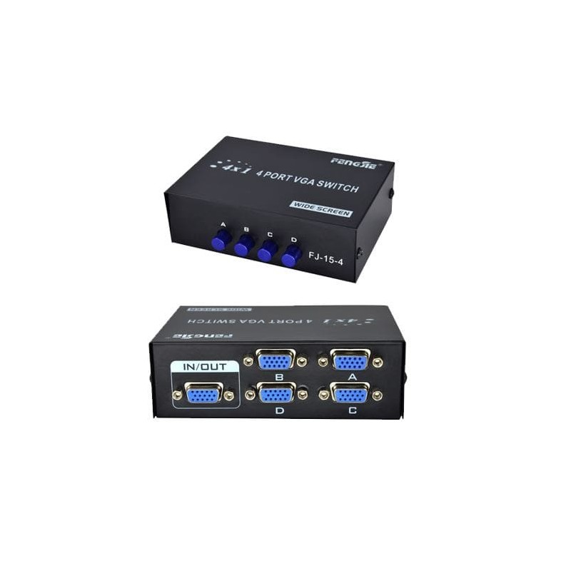 Switch VGA 4 x 1 to wysokiej jakości produkt, pozwalający podłączenie 4 komputerów do jednego monitora lub na na rozdzielenie sygnału VGA do 4 zewnętrznych odbiorników i oglądanie obrazu nie jednocześnie na 4 monitorach.