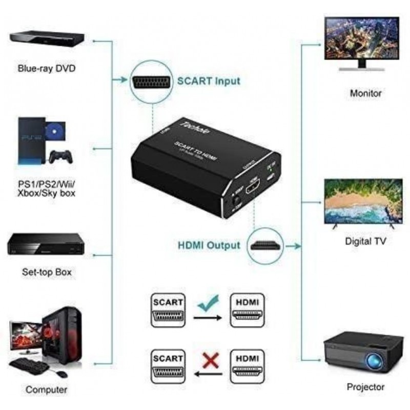 - Jednokierunkowość: z SCART na HDMI