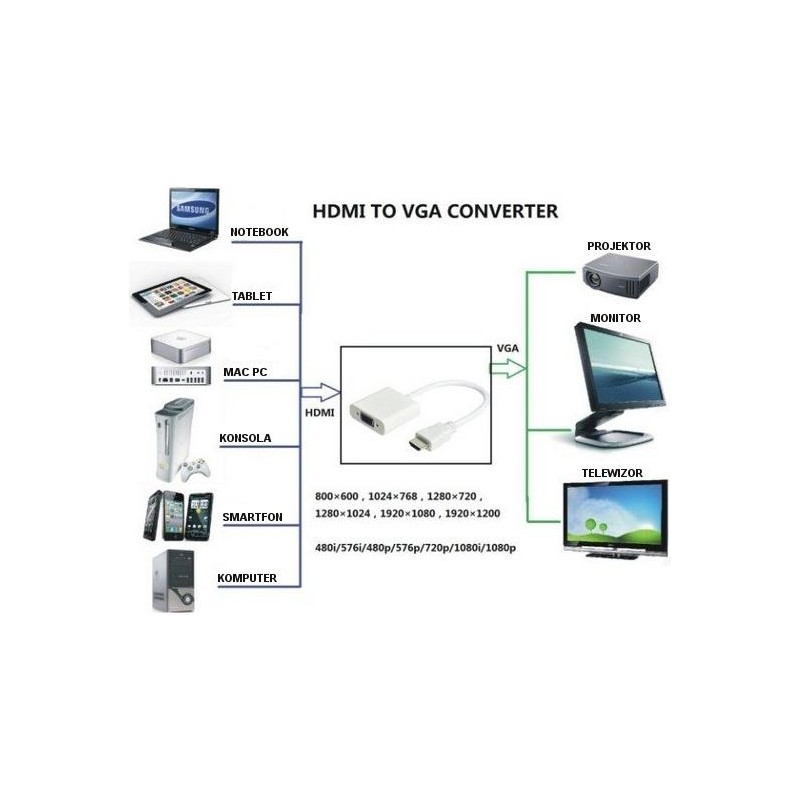 Pozwala na podłączenie monitora lub projektora ze złączem VGA do dowolnego urządzenia wyposażonego w złącze HDMI np. smartfonu, tabletu, laptopa, komputera, konsoli, itp.