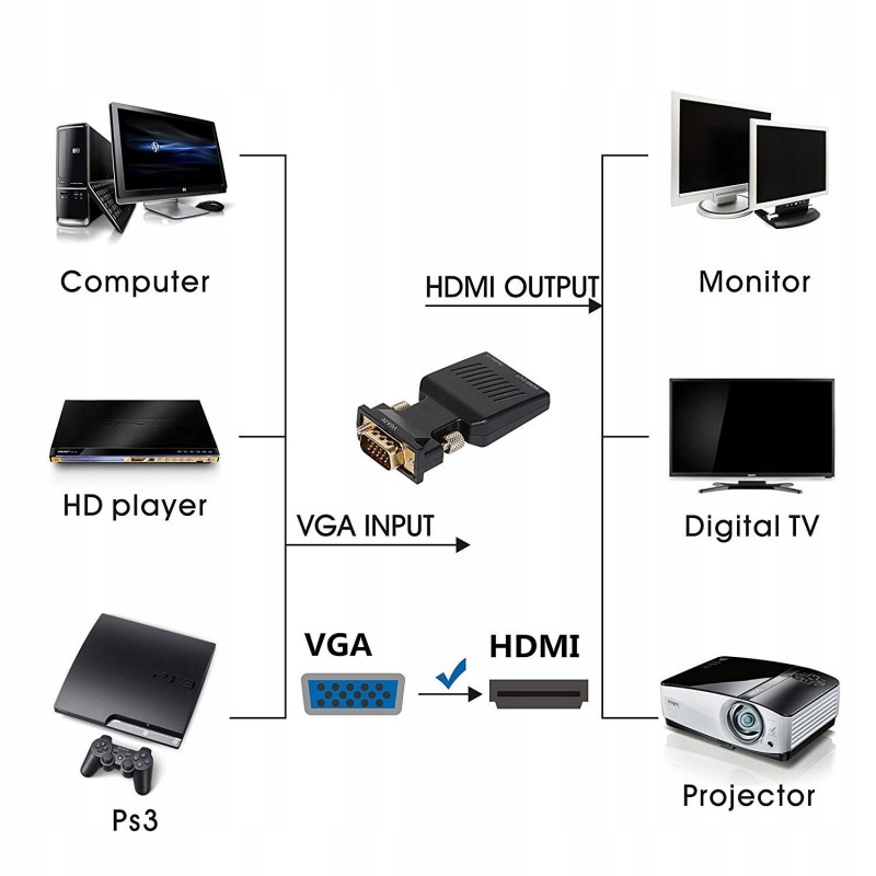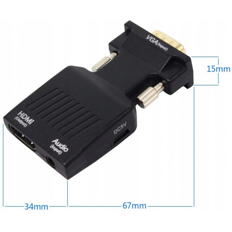 Najwyższej klasy adapter, umożliwia przesyłanie sygnału video oraz dźwięku z komputerów i urządzeń ze złączem VGA, oraz podłączenie ich do monitorów, wyświetlaczy, projektorów wyposażonych w złącze HDMI.