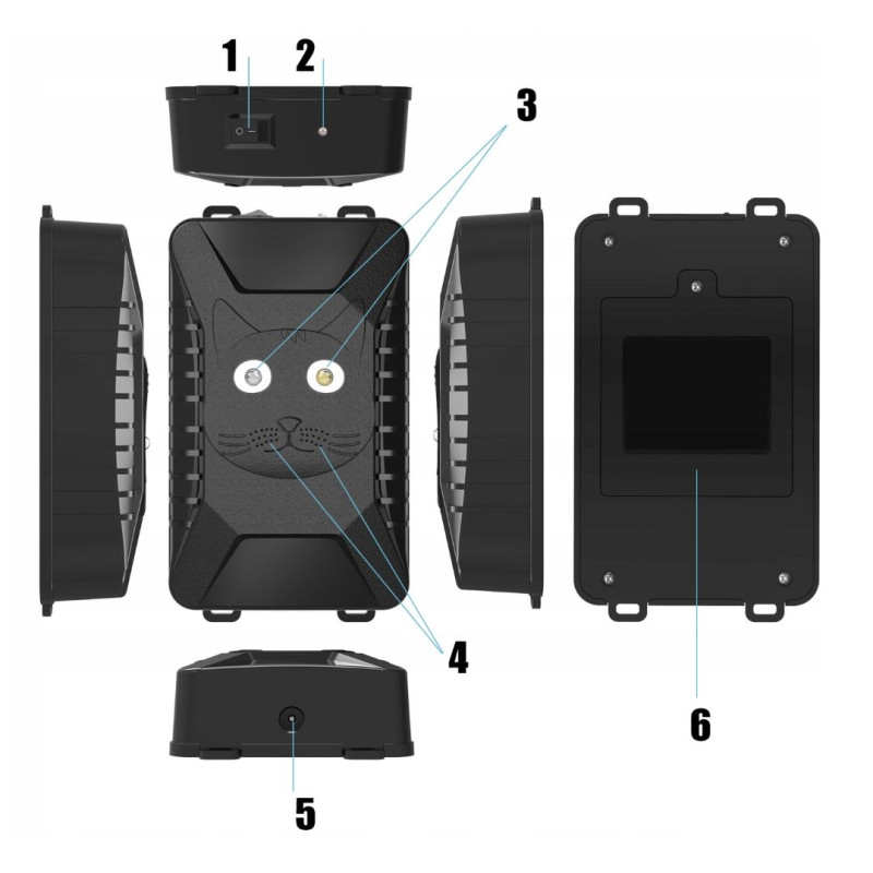 Wyposażone jest w generator ultradźwięków, diody LED typu flesz, diodę sygnalizacyjną oraz włącznik zasilania.