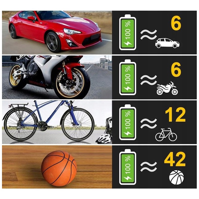 Kompresor umożliwia pompowanie kół pojazdów, materacy, piłek do gry, pontonów itp.