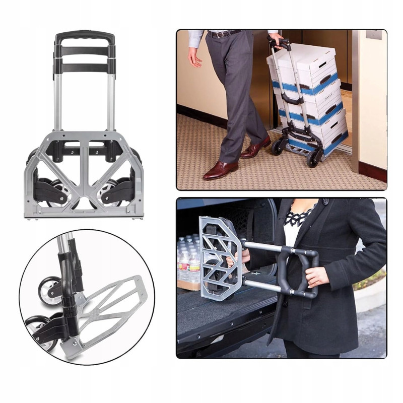 - Składany wózek mieści się w aucie – idealny do zakupów hurtowych, przenoszenia walizek, itp.