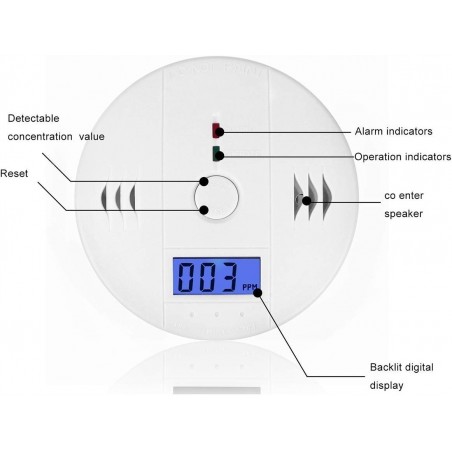 - Panel LCD wyświetla komunikaty (np. o niskim stanie baterii czy awarii) oraz poziom gazu(czadu) w zakresie od 0 do 999PPM*. Przekroczenie poziomu tlenku węgla sygnalizowane jest poprzez diody LED oraz bardzo głośny sygnał dźwiękowy (85dB).