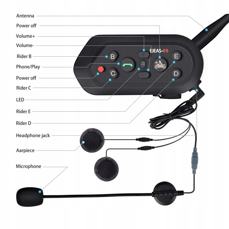 Interkom motocyklowy / rowerowy EJEAS E6 do kasku to jedno z najnowszych urządzeń od firmy EJEAS. Interkom zapewni swobodną komunikację między użytkownikami. Urządzenie można sparować również z telefonem, nawigacją czy też odtwarzaczem muzycznym poprzez bluetooth. Dzięki temu możemy odsłuchiwać komendy nawigacji, radio czy też muzykę w bardzo wygodny sposób. Model E6 posiada możliwość automatycznego odbierania telefonu. Możliwe jest również oddzwanianie na ostatni numer czy też wybieranie numeru telefonu głosowo (funkcjonalność zależna od modelu telefonu).