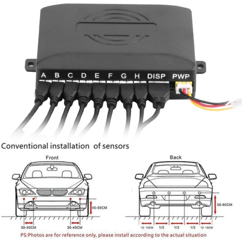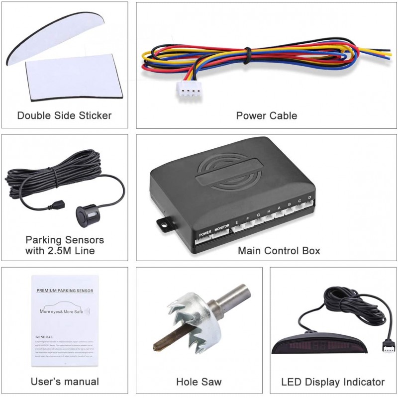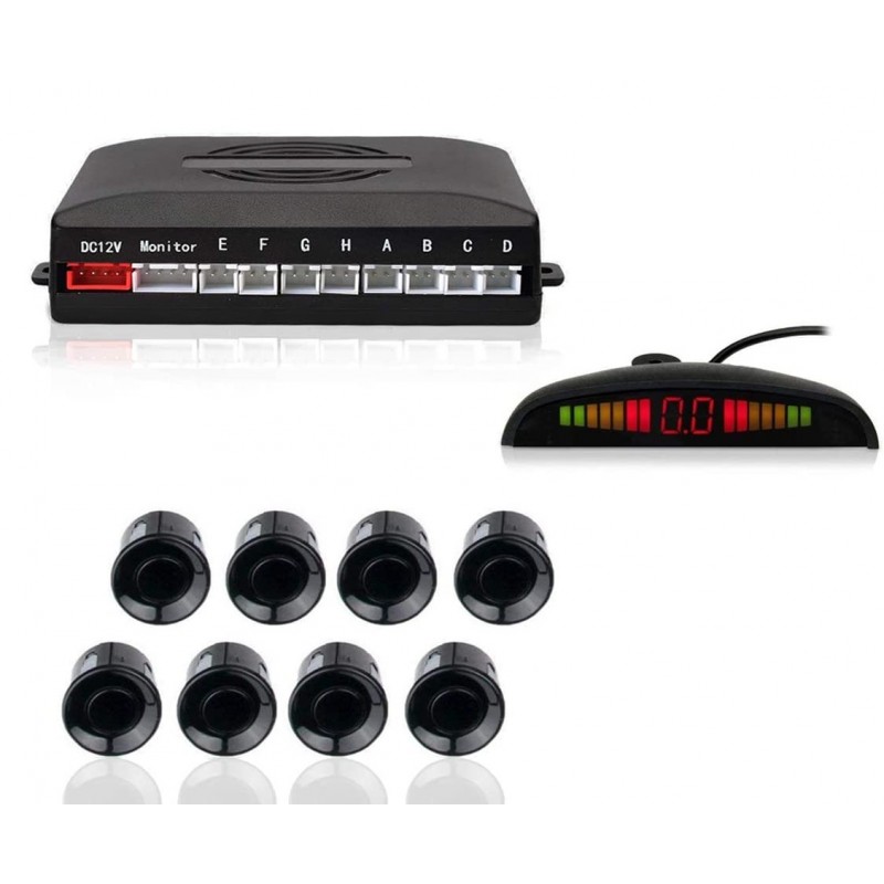 Uniwersalny system czujników parkowania, wyposażony w 8 sensorów oraz sygnalizator graficznym i dźwiękowy. Zestaw zapewnia bezpieczniejsze i łatwiejsze manewrowanie pojazdem. System nadzoruje obszar za samochodem i informuje kierowcę o zbliżaniu się do przeszkody. Urządzenie uruchamia się automatycznie po włączeniu światła cofania. Głośnik emituje sygnał dźwiękowy, gdy odległość pojazdu od przeszkody wynosi ok. 0,3 - 2,5 metrów. Dźwięk nasila się, gdy pojazd zbliża się do przeszkody. Zestaw wykrywa inne samochody, słupki, dzieci, zwierzęta i małe przeszkody.