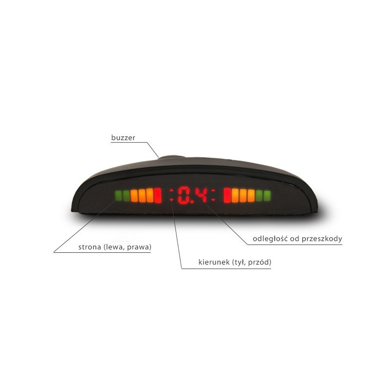 Sygnalizuje diodami oraz na panelu cyfrowym odległość od przeszkody