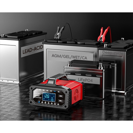 - Obsługa wielu typów akumulatorów: AGM, GEL, SLA, WET, EFB, Ca oraz LiFePO4 (z BMS).