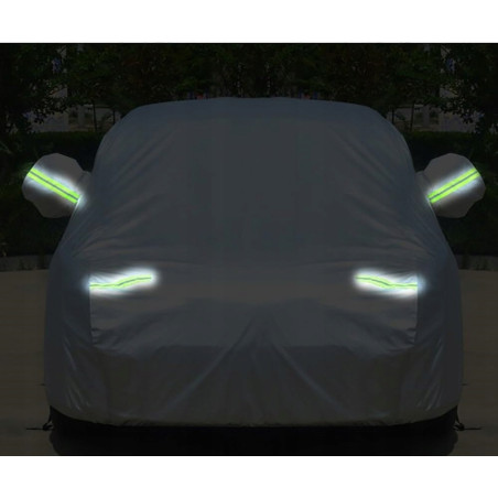 Pokrowiec samochodowy wyposażony w sześć odblaskowych pasków ostrzegawczych, które zwiększają widoczność pojazdu w nocy, zapewniając dodatkowe bezpieczeństwo. Paski znajdują się na lusterkach oraz na przedniej i tylnej części samochodu, co pozwala na lepsze oznakowanie pojazdu w słabych warunkach oświetleniowych.