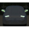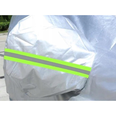 Pokrowiec samochodowy wyposażony w sześć odblaskowych pasków ostrzegawczych, które zwiększają widoczność pojazdu w nocy, zapewniając dodatkowe bezpieczeństwo. Paski znajdują się na lusterkach oraz na przedniej i tylnej części samochodu, co pozwala na lepsze oznakowanie pojazdu w słabych warunkach oświetleniowych.
