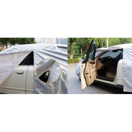 - Łatwość montażu: Dzięki zamkom błyskawicznym i elastycznym brzegom, pokrowiec można łatwo założyć i zdjąć, a jednocześnie gwarantuje on stabilne przyleganie do karoserii.
