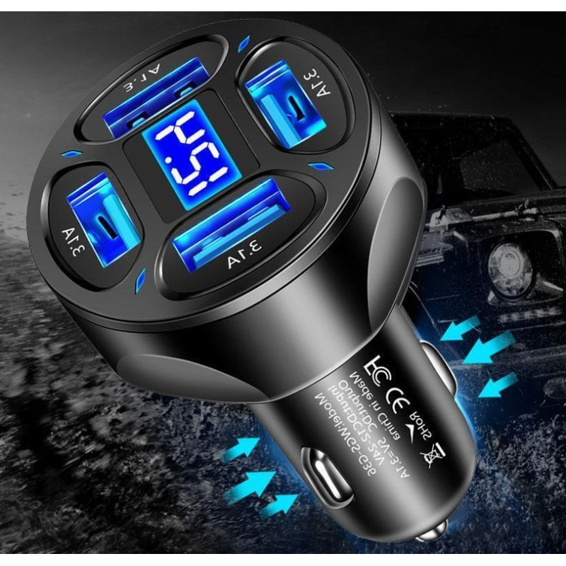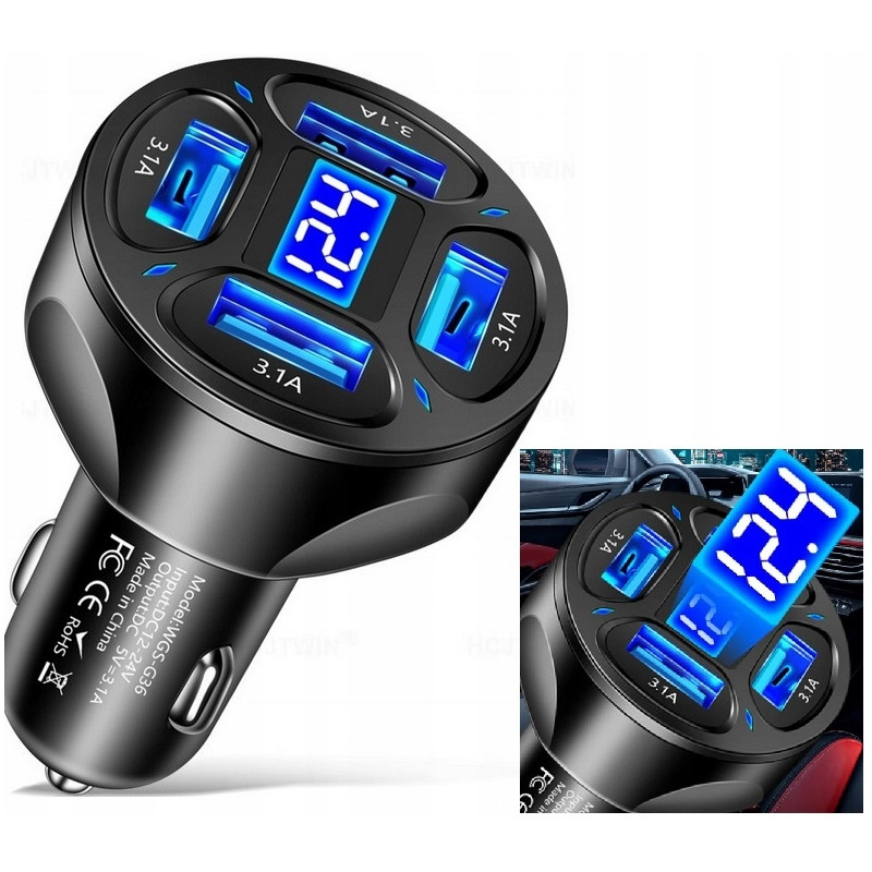 Szybka Mocna Ładowarka Samochodowa 4 USB 3,1A Rozdzielacz 66W LED wyświetl