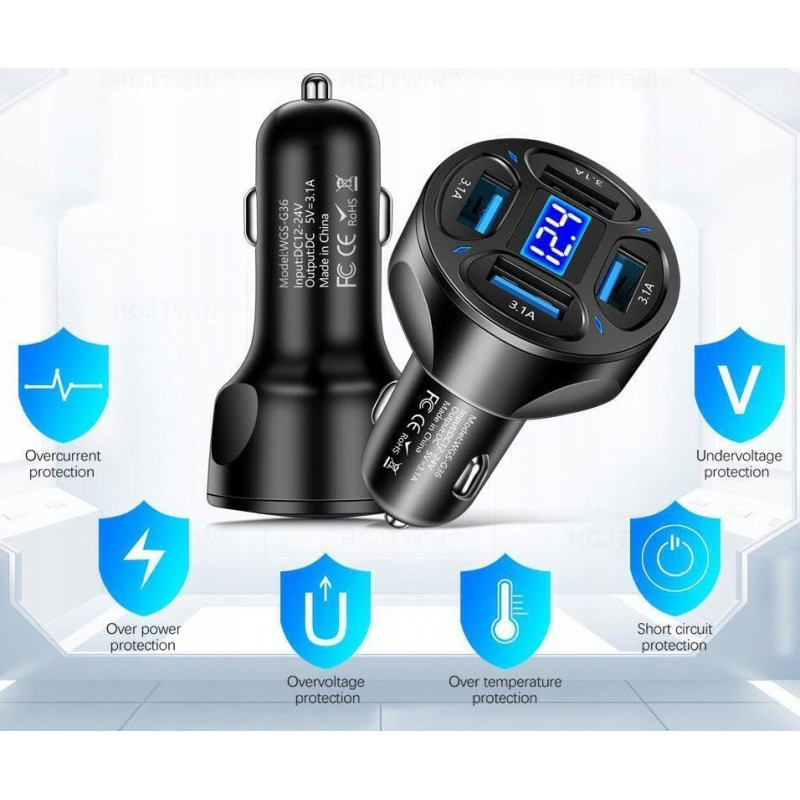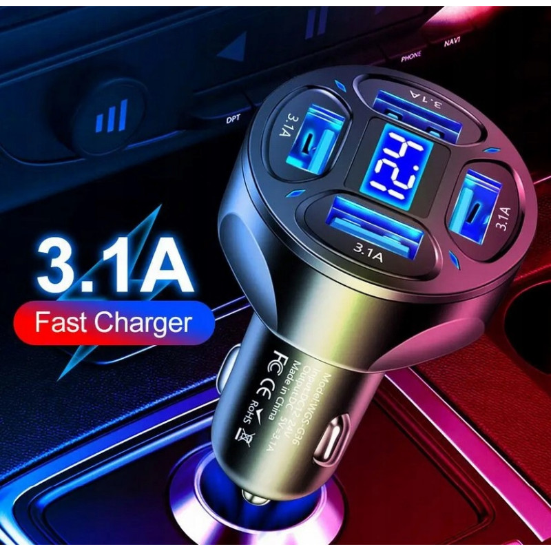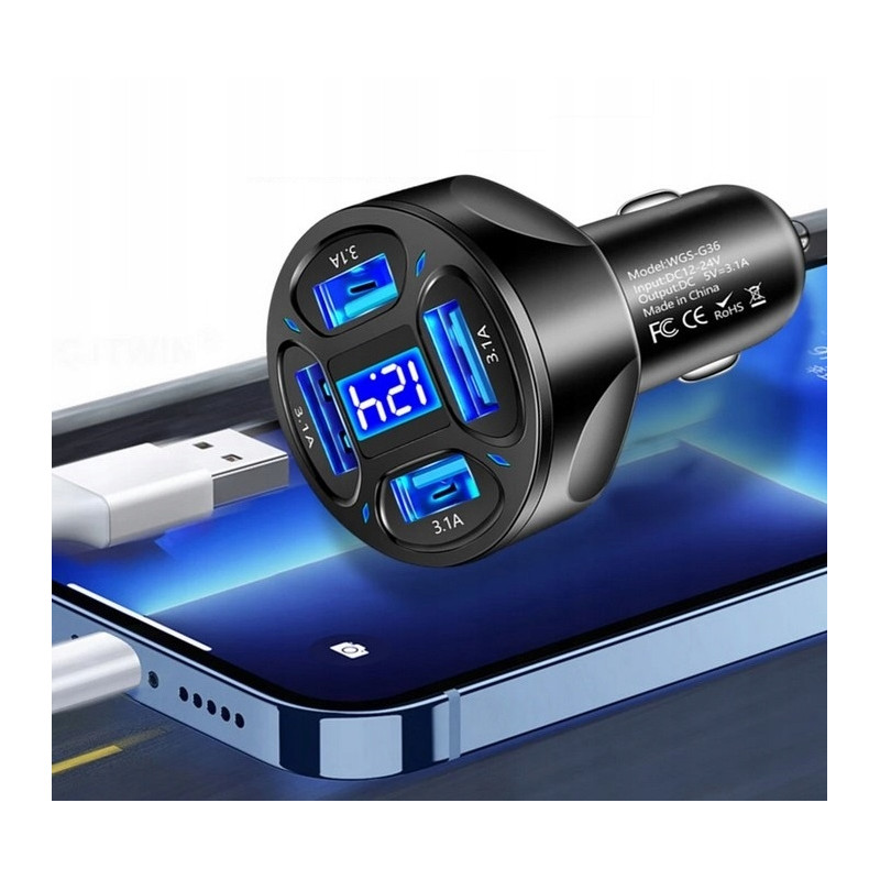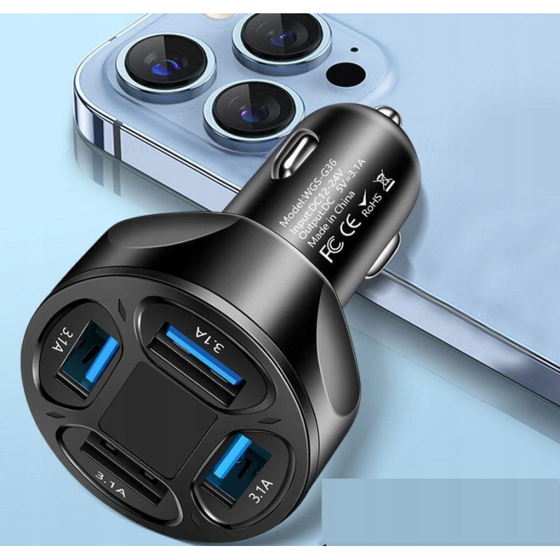 Szybka ładowarka samochodowa posiada cztery porty 3.1A do szybkiego ładowania.