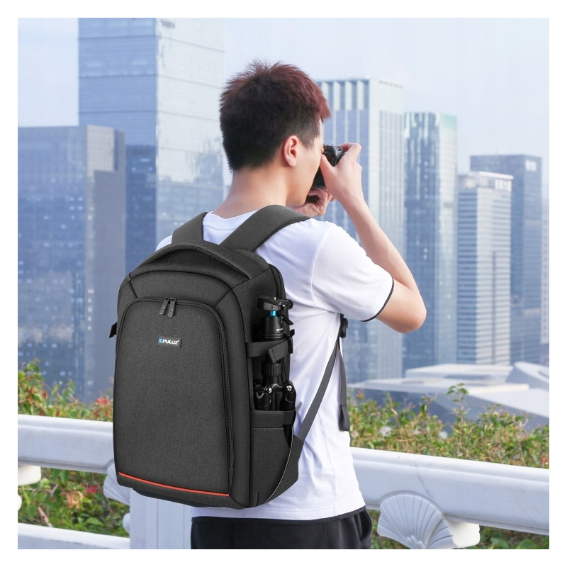 Elegancki Wygląd: Ciemnoszary materiał z delikatnymi czerwonymi akcentami oraz subtelne logo PULUZ nadają plecakowi elegancki, nowoczesny wygląd, który z pewnością przyciągnie wiele spojrzeń.