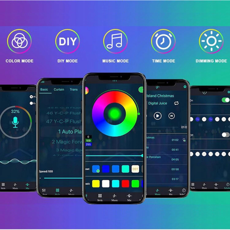 - Kontrola aplikacji: pobierz bezpłatną aplikację „Tuya” w Google Play lub Apple Store za pomocą smartfona. Dostosuj jasność i prędkość, wybierz różne kolory i tryby.