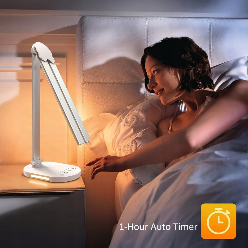 Podstawa lampy biurkowej emituje z ciepły światło po obu stronach podstawki. Bardzo dobre wieczorem do zasypiania. Lampka idealna do użytku jako lampka nocna do spania w sypialni. Posiada funkcję automatycznego wyłączania po 1 godzinie, dzięki czemu nie musisz się martwić o zasypianie podczas czytania w nocy