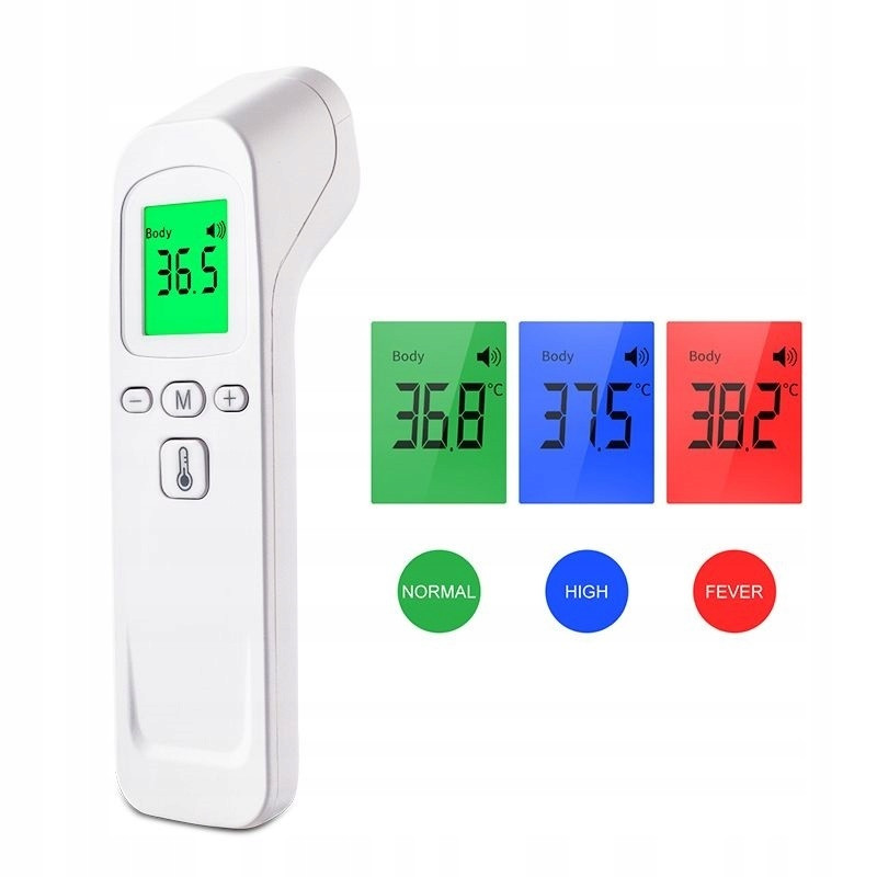 Kolory wyświetlacza informują o aktualnej temperaturze: zielony oznacza normalną temperaturę, żółty to sygnał podwyższonej temperatury, a czerwony wskazuje na gorączkę.