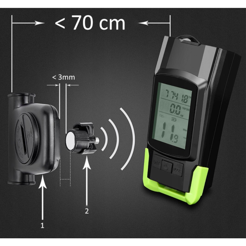 - Sensor prędkości który montuje się na przednie widełki roweru jest bezprzewodowy, wystarczy założyć go na widełki i nie trzeba martwić się o przeprowadzenie kabli.