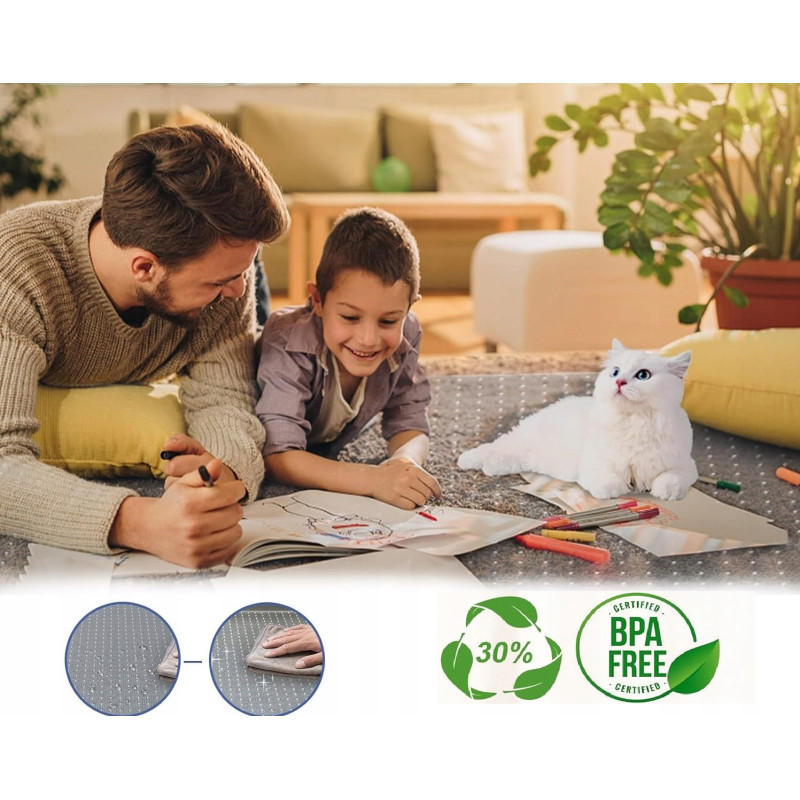 - Bezpieczna i Ekologiczna: Mata nie zawiera BPA, ftalanów ani toksyn lotnych, co zapewnia zdrowe środowisko wewnętrzne.