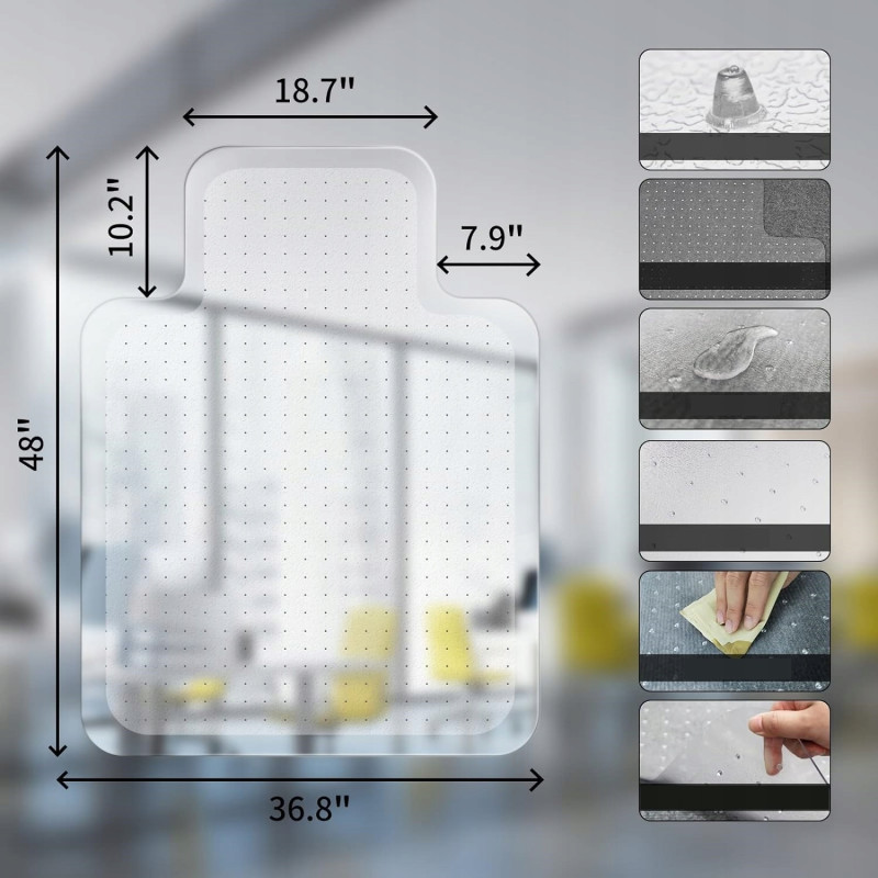 Skutecznie chroni niskie dywany oraz wykładziny przed zużyciem, rozdarciami, plamami i zabrudzeniami spowodowanymi przez codzienne użytkowanie foteli biurowych.