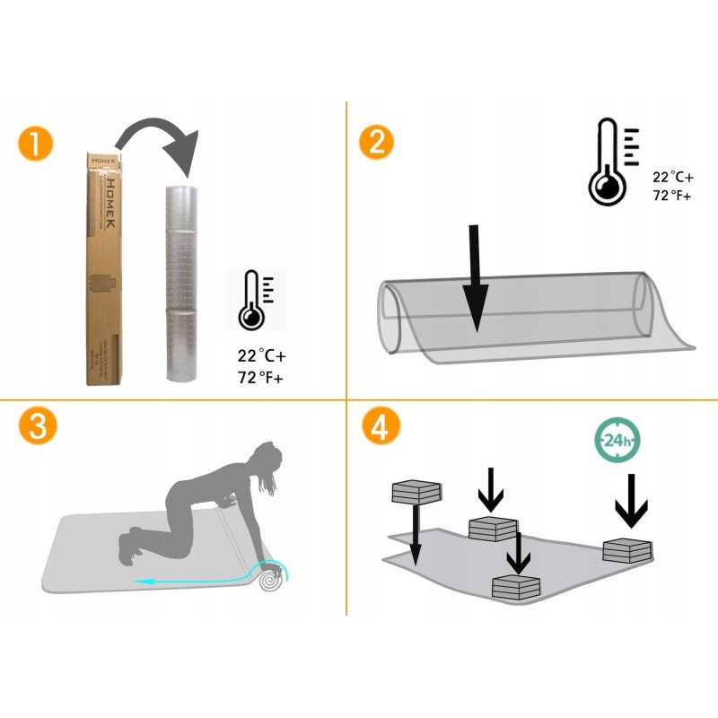 Rozpakuj matę i ogrzej ją do temperatury pokojowej 22°C/72°F (możesz użyć gorącej wody pod prysznicem lub wystawić ją na słońce), aby łatwiej się rozwijała.